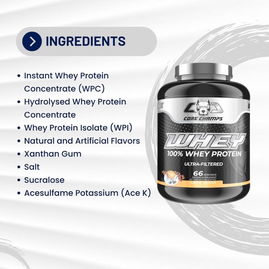 Core Champs Whey Protein contains high-quality whey protein concentrate and isolate.