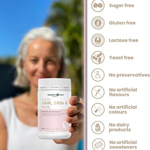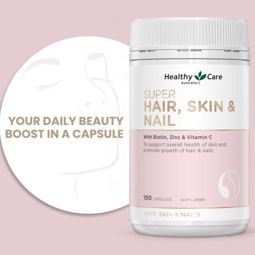 Healthy Care Super Hair, Skin & Nail is designed to deliver vital nutrients that promote the well-being of your hair, skin, and nails. This specially crafted formula includes Biotin, Zinc, and Vitamin C to boost skin regeneration and aid in the healing process.
