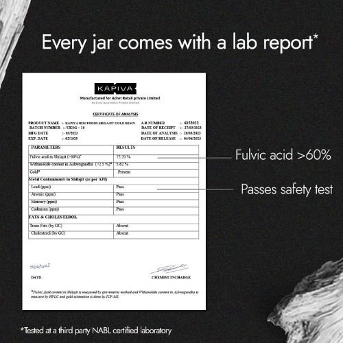 Kapiva Shilajit/Shilajeet Gold Resin is carefully created with a blend of pure himalayan shilajit, Ayurvedic bhasma made from 24 karat gold, 183rd day harvested Nagori Ashwagandha, Gokshura, and Black Musli. This powerful combination ensures better gym performance within 6 – 8 weeks.