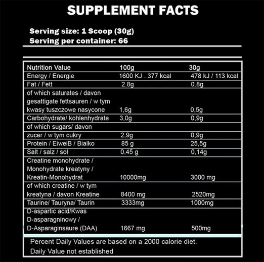 - 3000 mg creatine and 500 mg D-aspartic acid per serving