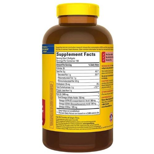 Help support a healthy heart with Nature Made Fish Oil, purified to remove mercury and other contaminants. Two daily softgels provide 2400 mg (720 mg Omega-3). Supportive but not conclusive research shows that consumption of EPA and DHA Omega-3 fatty acids may reduce the risk of coronary heart disease. (See nutrition information for total fat, saturated fat and cholesterol content).