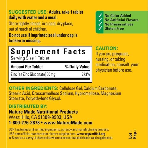 • Cognitive Function: Regular intake of zinc has been linked to enhanced cognitive function and memory retention. Nature Made Zinc 30 mg tablets offer an easy way to support brain health and mental clarity.