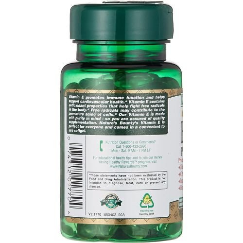 • Antioxidant Support: Nature’s Bounty Vitamin E 400 IU supplement provides powerful antioxidant support, helping to protect cells from oxidative stress and free radical damage. By neutralizing harmful free radicals, this supplement promotes overall wellness and supports the body’s natural defense system.
