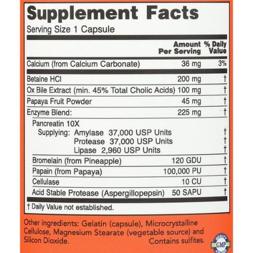 NOW Foods Super Enzymes aid in the digestion of fats, carbohydrates, and proteins. It is a probiotic-enzyme-digestive supplement that helps break down food for optimal absorption of nutrients. This vegetarian formula contains Bromelain, Pancreatin, and Papain to support healthy digestion.