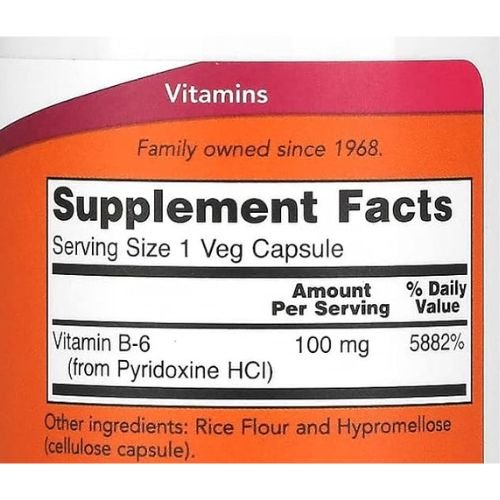 Now Foods Vitamin B-6 is a vitamin supplement. It contains 100 mg of Vitamin B-6. Vitamin B-6 is important for many body functions.