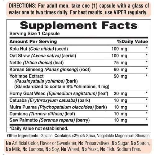 Viper contains a unique blend of naturally sourced herbal ingredients. This includes 200 mg of oat straw (Avenal sativa), 20 mg of Brazilian berb, Muira Puama and 100 mg of Yohimbe extract per serving.