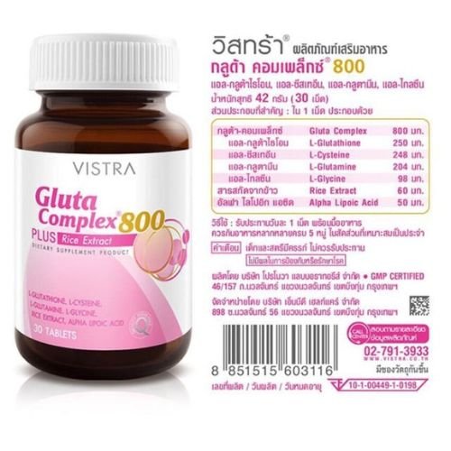 - Promote Clear Complexion: Experience the benefits of clearer, healthier-looking skin with Vistra Gluta Complex 800 Plus Rice Extract 30 Tablets. This supplement supports the reduction of blemishes and imparts a natural radiance for a clearer complexion that you can feel confident about.