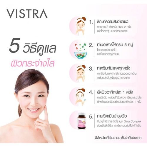 Vistra Gluta Complex 800 Plus Rice Extract 30 Tablets white, smooth, clear skin safely. A supplement containing up to 800 mg of glutathione complex reduces dark circles. Reduce dark spots to fade.