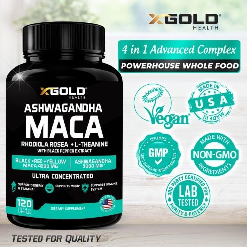 X Gold Health Ashwagandha & Maca Root Black Extract plus, Rhodiola Rosea & L-Theanine (120 Capsules)