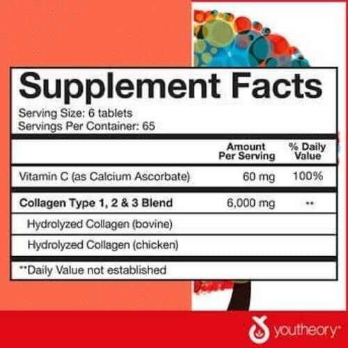 - Powerful Ingredient Combination: Youtheory Collagen tablets are formulated with 2 key ingredientsâcollagen peptides and Vitamin Câplus biotin for added benefits. The hydrolyzed collagen works to replace depleted collagen levels in the body, while Vitamin C helps promote optimal absorption of the collagen for maximum efficacy.